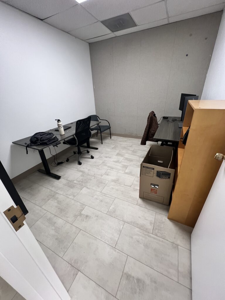 - Flooring Installation: Installed luxury vinyl tile (LVT) in office areas with clean transitions and baseboards.